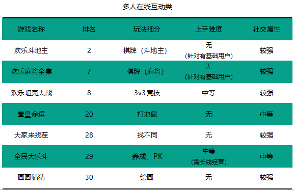 打入Top30的14款小游戏中所占比重最大的是多人在线互动类小游戏,共有7款。这是一个比较广泛的分类,这一类游戏基本都具备创建房间、邀请好友、联机竞赛等特质。棋牌类游戏《欢乐斗地主》和《欢乐麻将全集》也被划分到这一类中。此外还有《欢乐坦克大战》、《拳皇命运》、《大家来找茬》、《全民大乐斗》以及《画画猜猜》。