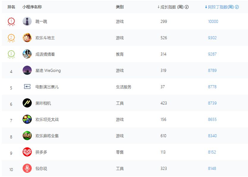 从小程序统计平台阿拉丁给出的统计数据可以看到,近一周内游戏类小程序表现强劲。在该网站统计出的“阿拉丁指数”Top30的小程序中,游戏性质的小程序有14款之多,并且其中有6款排在Top10。前四名更是完全被游戏类小程序包揽,它们分别是:《跳一跳》、《欢乐斗地主》、《成语猜猜看》以及《星途WeGoing》。