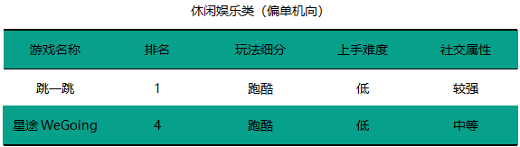 以跳一跳为代表的休闲娱乐类单机小游戏最受用户欢迎。虽然在打入Top30的14款小游戏中,休闲娱乐类的单机游戏只有《跳一跳》和《星途WeGoing》这两款,但这两款小游戏的成绩非常棒,分别拿到了第一和第四名。