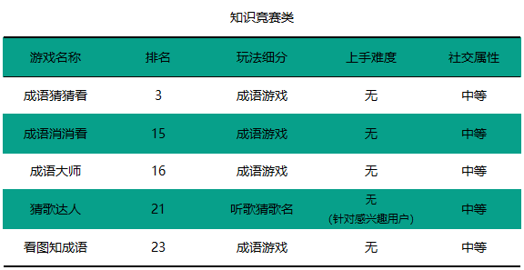 在打入Top30的14款小游戏中,知识竞赛类占到5款,其中有4款涉及到成语,它们分别是《成语猜猜看》、《成语消消看》、《成语大师》、以及《看图知成语》。值得一提的是,这其中有3款小程序玩法雷同。但即便是雷同的玩法,每款小程序仍均能拥有较高的用户活跃度,可见在这一类型中,市场前景很大。