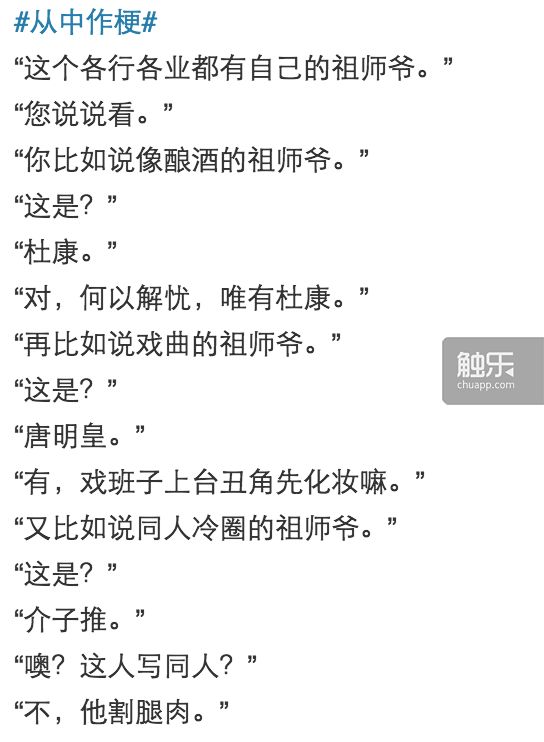 “从中作梗”是敦煌郡公自己创作的冷笑话合集。与一般段子不同的是,他的材料往往选自人们不甚熟悉,或不常见的史料和文集,视角和语言也“颇为清奇”。他既可以把马陵之战解为“历史上规模最大的祭灶活动”,也可以把大家挂在嘴边上的“好姬友”解为“纪念郑桓公”,更可以把康熙年间的《三藩纪事本末》说成“美国旧金山的建城史”。