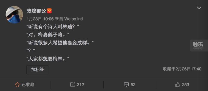 在冷笑话之外,敦煌郡公对于文学、历史和文化的态度要严肃很多。他从2015年开始记录自己的书帐,从诗歌、小说、史料、社科文献到通俗文学、生活百科,古今中外,涉猎甚广。除了对于书名的列举,书中令他觉得有意、有趣、有感的词句或段落,也摘录在微博上。