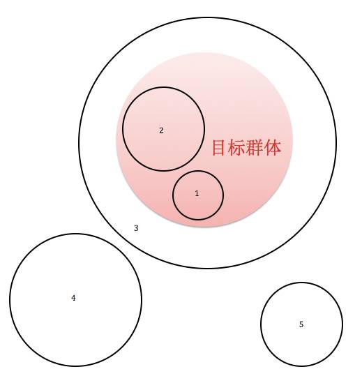 请看下图,红圈子是你想要获得的目标受众。圈1和圈2是精准用户拉新,圈3是大量拉新再筛选,圈4和圈5是目标受众完全偏离的拉新。所以,哪怕是拉票活动,只要你能包含或者被包含目标群体,活动就在正轨上。但如果你的活动吸引来的是和目标群体完全没有重合的人群,后期必然大量流失。