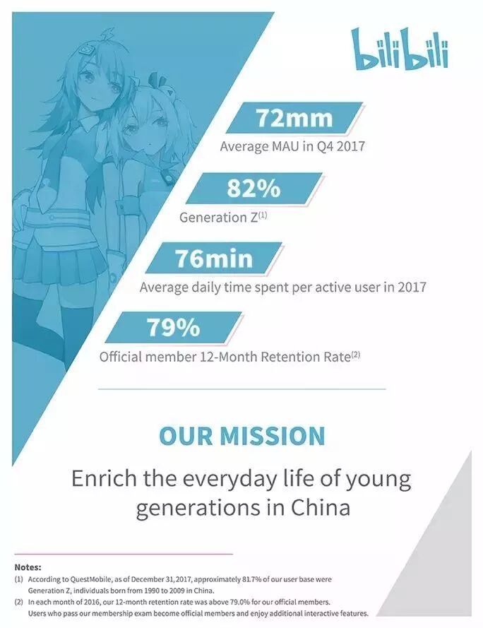 从2009年到现在,B站身上的“二次元”标签一直都未曾变过。从初始限制用户注册设置的100问,通过答题才能成为正式会员抬高了B站社区的准入门槛,对于B站氛围的形成起到了助力。这种几乎是由核心群体组成的社区有着很高的粘性和归属感,根据招股书披露的数据,正式会员12个月之后的留存率高达79%,这个数字很难有其他视频网站能够达到。这也与创始人徐逸、如今的CEO陈睿对于二次元都有着很深的理解不无关系。