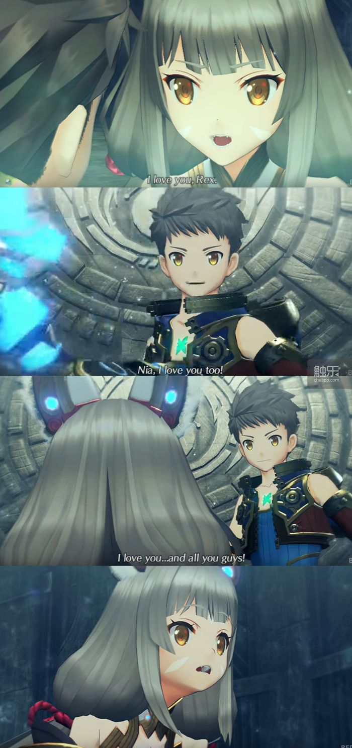 第一段经历来自《异度之刃2》。尼娅作为游戏前期加入队伍、一路辅助莱克斯过来的角色,逐渐坚定了自己的信念,最终在危急时刻说出了自己一直以来压抑的秘密和情感。然后呢,得到了莱克斯的回复:“我也最喜欢尼娅了!……还有大家!”