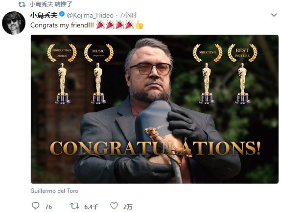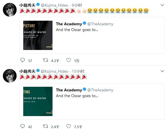 一直梦想成为导演的小岛和想要制作游戏的陀螺应该是相当有共同语言的,他俩私交甚密,还频繁进行商业互吹。推特上班的小岛曾为《水形物语》写过影评,今天电影获奖后,他好像比陀螺还高兴,连发数条推特表示祝贺。