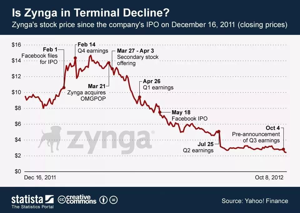 SNS游戏和页游大佬Zynga曾经风光无限,膨胀到想要踢开Facebook单干。没曾想老大的屁股还没坐热,SNS游戏就被手游赶到了历史的回收站,如今Zynga落得个无人问津的地步,股价比Rovio还要惨,被砍掉三分之二。另一个手游大厂,靠《糖果粉碎》走红的King,也以八折股价贱卖给了动视。