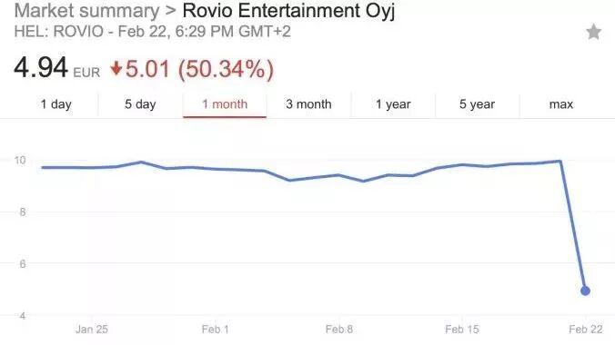 在这一天,手机游戏巨头Rovio遭遇到上市以来最大的股灾。在短短的几个小时内,Rovio的股价惨遭腰斩。从前一天收盘时的9.94,猛跌到4.94,市值瞬间蒸发一半。