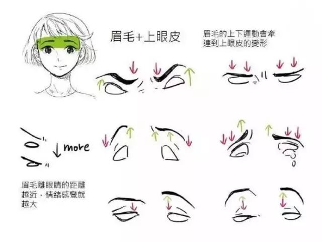 ▲眉毛在上下运动时,会牵连到上眼皮的变形,从而表现出不同的情绪。