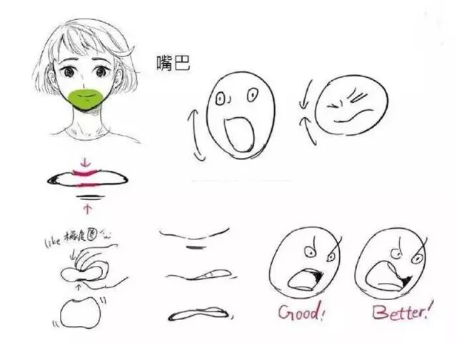 在绘制时,我们可以把头部想象成一颗皮球,下巴的开合与眉头的挤压,让整张脸富有弹性。