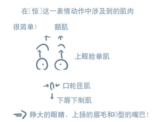 ▲以“惊”为基调的表情变化背后,都有一个共同的五官变化规律,即眉毛上抬、眼睛睁大、嘴巴呈O型变化。