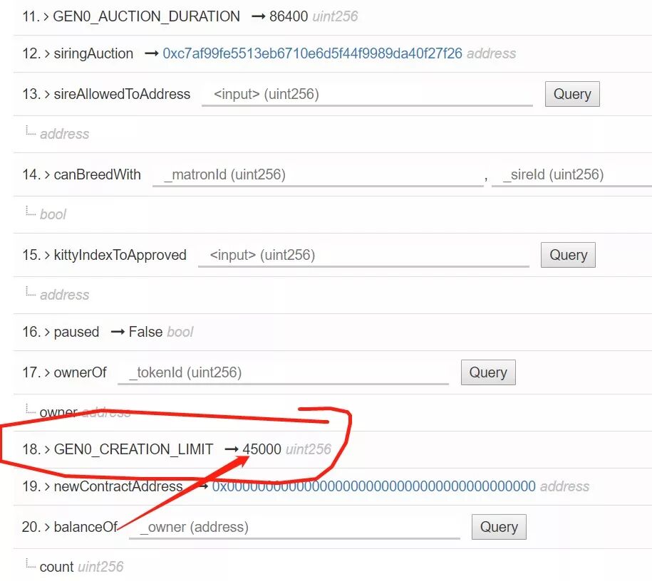 比如在cryptokitties中,团队表示0代猫(gen 0)只会有45000只,那么这个数字我们可以在智能合约中进行核查。如下图。