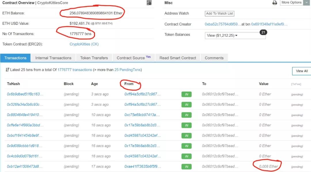 下图是CryptoKitties的智能合约的交易记录。在这里,我们可以清楚的看到游戏开发商赚了多少钱,一共发生了多少笔交易,都有哪些玩家参与,每个玩家在做什么。这里我们可以看到有一位玩家刚刚执行了“繁殖”的指令,有7位玩家刚刚执行了“销售”的指令。