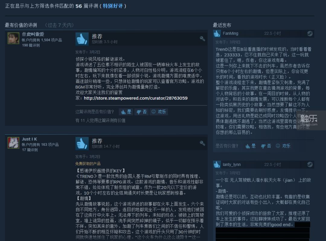 这款以火车为场景、以推理为题材的游戏由RPG Maker制成,流程约10小时,根据玩家选择的不同设计了多种结局。游戏上线之后口碑很不错,我Steam首页上的5个鉴赏家有4个推荐了它。尝试之后,我也陷入了《Tren0》当中不能自拔,然后在一个字谜环节中卡了关。为了通关,我只得前往Steam评论区寻找答案,期待着有大佬能够指点迷津,却不料在这里看到了游戏开发背后的一些故事。