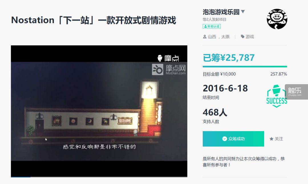 2016年5月,在完成了《下一站》前两章的Demo后,泡泡为筹集资金在摩点网为游戏发起了众筹,目标为1万元。游戏因为不错的设定很快得到了围观群众们的热烈回应,1个月时间,项目筹得了两万多块,远超目标。摩点网的工作人员告诉泡泡,参加这次众筹的用户中有75%都是新注册的,这在以往并不多见。