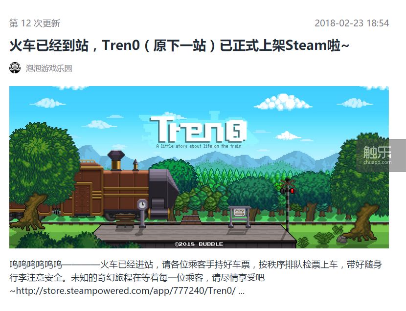 2月23日,由泡泡独自担任程序和美术、耗时9个月制作的游戏《Tren0》在独游网的帮助下成功在Steam平台上架,此时距离原定的游戏发行时间已经过去了近一年半,距离他产生做这个游戏的想法已经过去了近3年,距离他踏入游戏圈子已经11年。