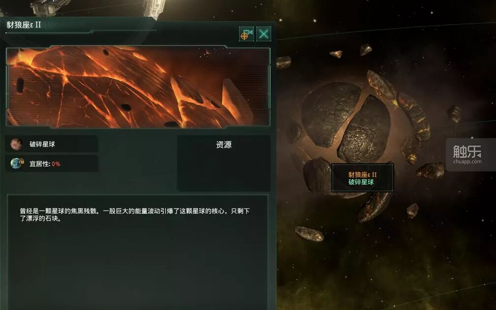 在游戏中,被巨像射爆的行星会被变成破碎行星,还有一定几率产生12单位的矿产。由于《群星》这款游戏中的矿物也是一个十分玄学的概念(全银河通用一种矿产),我们就暂时先不谈行星破碎后为什么会产生更多矿物的问题,而是先来看游戏中对破碎行星的描述: