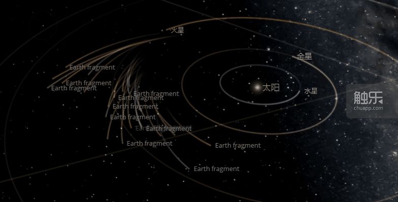 从这张模拟图中可以看出,在地球被炸掉后的几天内,碎片会在在恒星引力的作用下围绕太阳轨道运动,还有一小部分碎片会由于初速度过快直接挣脱太阳的引力,直接飞出太阳系,永远在宇宙间游荡,直到被下一个恒星系的引力捕获。