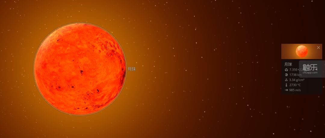 因此,我们只能从微观角度看看地球爆炸后,会对离我们最近的星体——月球产生什么影响。同样是用《宇宙沙盒2》这款游戏进行模拟,只不过这次只有局部模拟,模拟的准确度与精细程度要提升许多。我们可以看见,在地球爆炸之后,其实也有一部分碎片会直接喷射到月球上,在短时间内让月面温度上升到3000摄氏度。