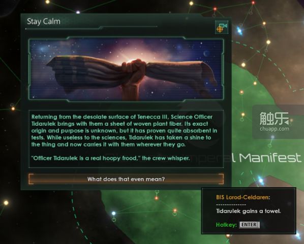 正如我在前文所说,在《群星》这款游戏里虽然玩家可以摆脱历史,不再自己被自己剧透,但失去了历史的限制,P社的那些“瑞典蠢驴”们也开始彻底放飞自我了。从《群星》游戏本体到历代DLC,他们致敬、恶搞、Neta了《星际伞兵》《海伯利安》以及“光环”系列、“星球大战”系列等科幻名作,他们的一些任务甚至还提及了旅行者一号探测器以及“罗素的茶壶”这一哲学概念。