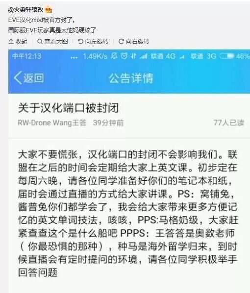 EVE国际服某联盟在汉化端口封闭后,迅速组织了定期英文课,帮助联盟成员提高英语水平,早日适应游戏节奏。
