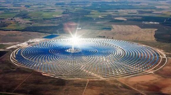 通过反射汇聚太阳光中的热能并加以利用——这是“死光”传说的核心,同时也是现代聚光型太阳能热发电系统的根本设计理念。上图中,地面上铺设的全部都是反射镜,而汇聚起来的光线足以在中央集热塔产生超过1000摄氏度的高温:如此强大的热能,足以支撑锅炉与蒸汽轮机的运行。