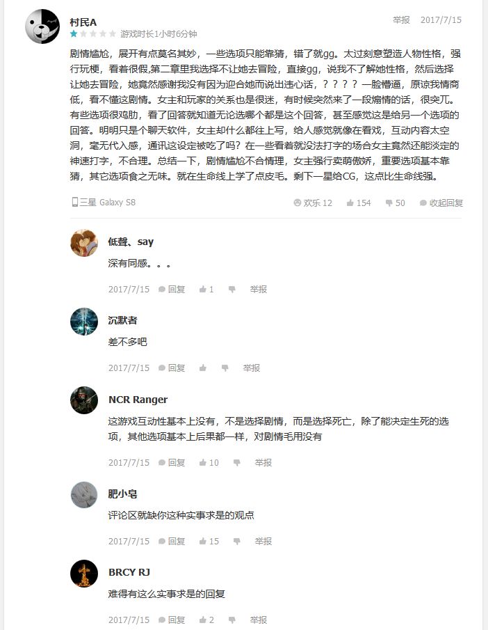 但文章开头也有提到,虽然在TapTap上拥有9.0的不错评分,但从全网来看,《异次元通讯》这款游戏评价两级分化比较严重。而游戏的大多数差评依旧来自于二次元用户,且多为深度AVG或Galgame玩家。