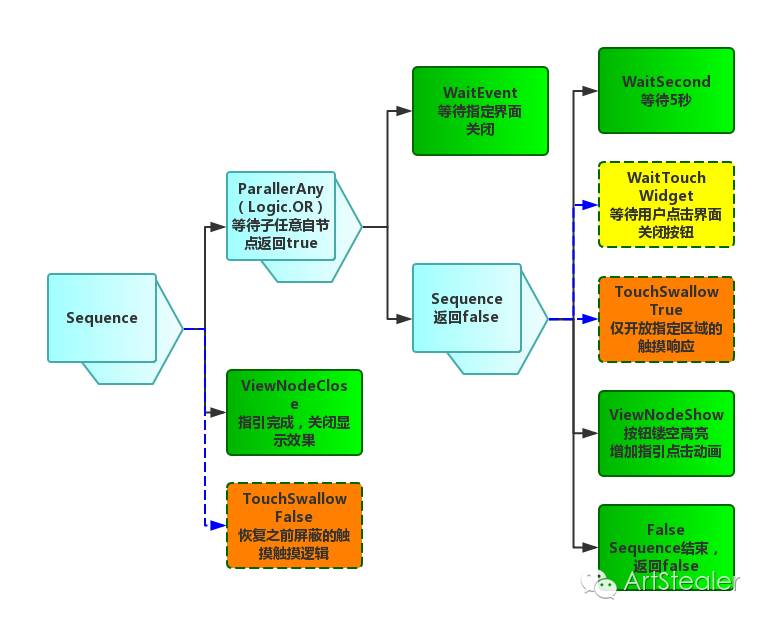 这也是我这几年经历了3款网游的引导系统设计不断地完善总结出的实用解决方案,也是我们现在正在研发的游戏所采用的引导系统:基于行为树的引导系统.