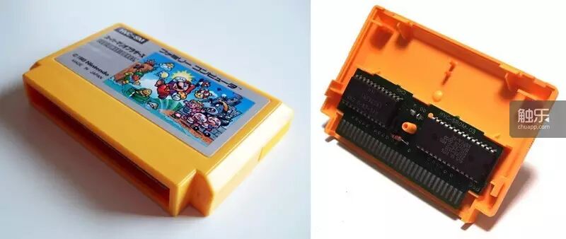 拆开FC卡带,可以看见这块60个引脚的电路板上搭载的ROM芯片,游戏程序就存放在这里