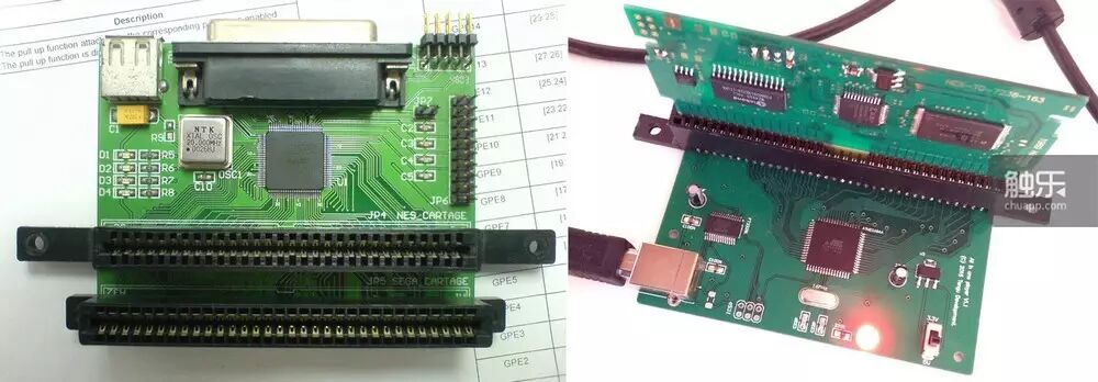 左图为TPU早期设计的集FC卡槽、MD卡槽于一体的dump设备,右图为byemu制作的2015新版FC卡带dump设备