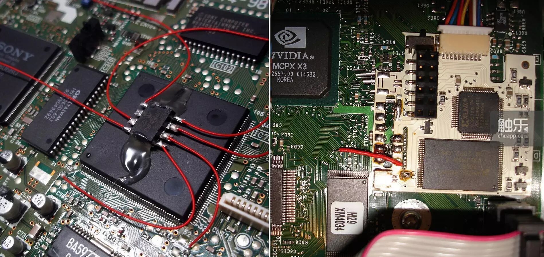 左图为PS直读芯片,右图为Xbox直读芯片。直读芯片问世后,光盘游戏的dump及复制开始大规模流行