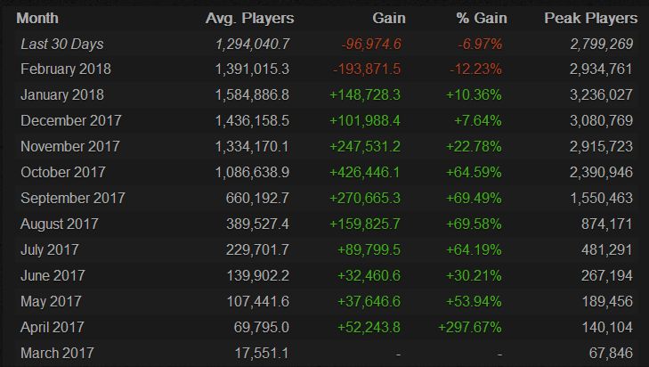 外挂给游戏带来的恶劣影响表现在《绝地求生》的玩家数据上。根据Steam Charts网站统计的数据,《绝地求生》的最高在线人数已经从巅峰期超320万降至270万左右。值得注意的是,去年10月份《绝地求生》用户增速开始处于放缓态势,今年2月份月活跃用户数开始下滑,环比上个月下降12.23%,在最近三十天依然处于下滑态势。