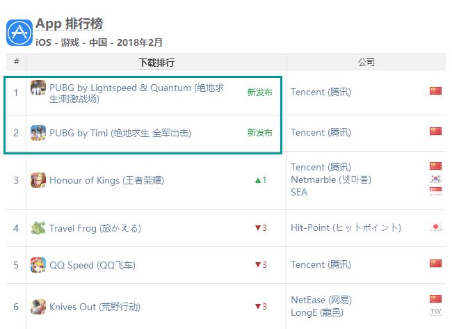 随后,腾讯也赶在春节之前上线了两款《PUBG》手游,抢下了春节这波用户红利期。App Annie数据显示,在2月份iOS中国游戏下载榜中,《刺激战场》和《全军出击》分别占据了一、二名。最终国内市场形成了以腾讯、网易两家吃鸡手游为主的态势,抢下了绝大部分的市场份额。