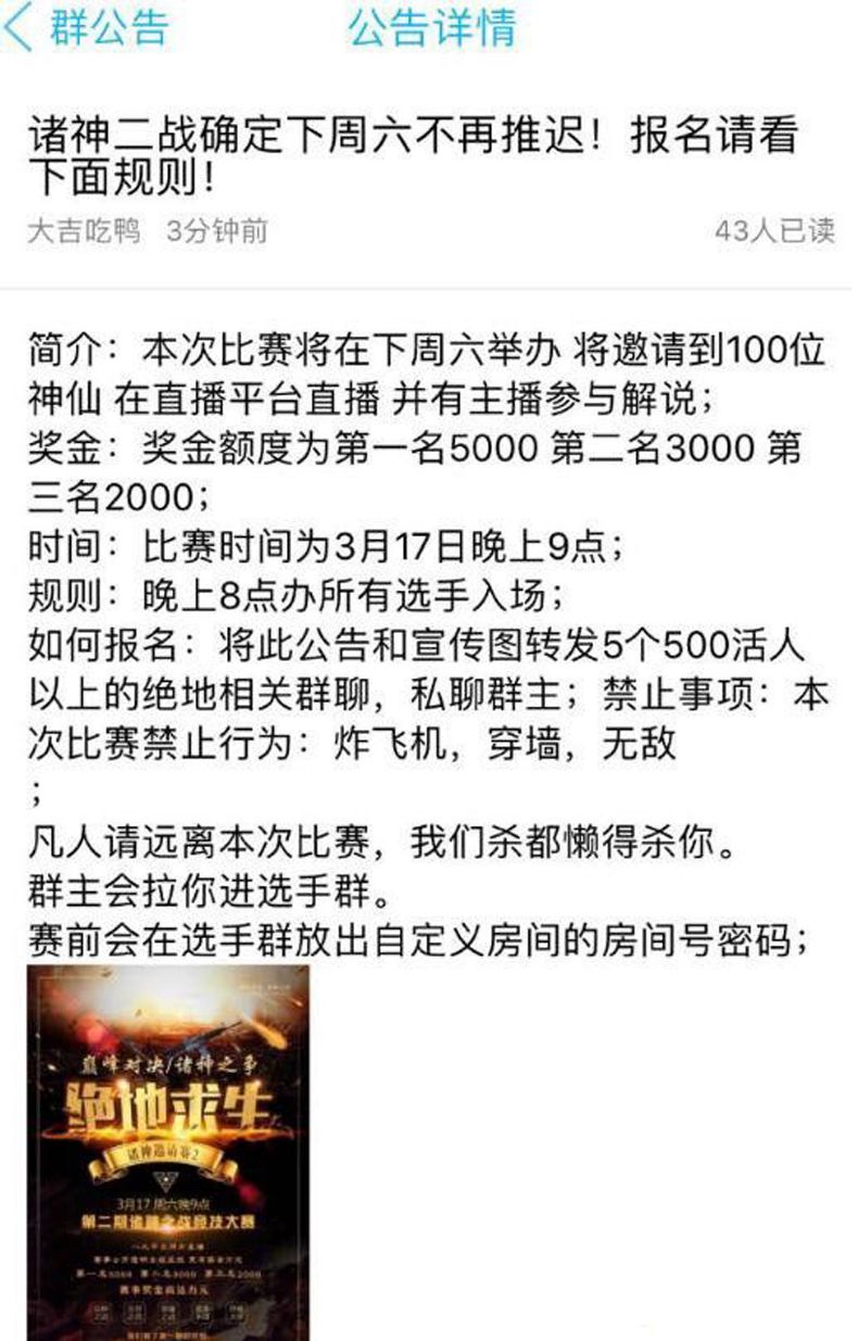 更有甚者,大旗一挥举办《绝地求生》“诸神之战”外挂比赛,“凡人就别来了,你会怀疑人生”。近期,“诸神之战”第二届召开的消息传出,还有主播参与解说,但最终这场“神仙打架”也以群主收到律师函而告终……
