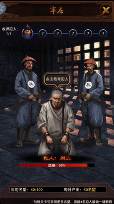 2. 核心玩法简单但包装众多,且拥有成熟的周边系统和数值体系。官场游戏的资源循环系统易于理解,养成玩法也不复杂。它会用处理政务、打理资产、训斥犯人等多种简单的玩法把收集资源的过程包装起来,并通过战斗作为出口,让玩家用最简单的方式感受到收集和消耗资源的成就感。
