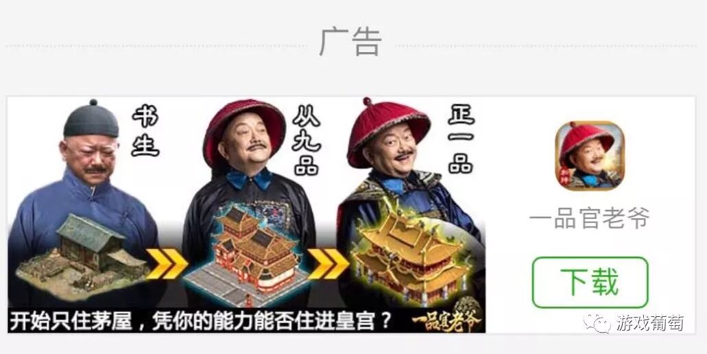 大多数官场游戏在广告素材上都选择彰显题材特殊性的纯图片广告为主,例如呈现游戏玩法: