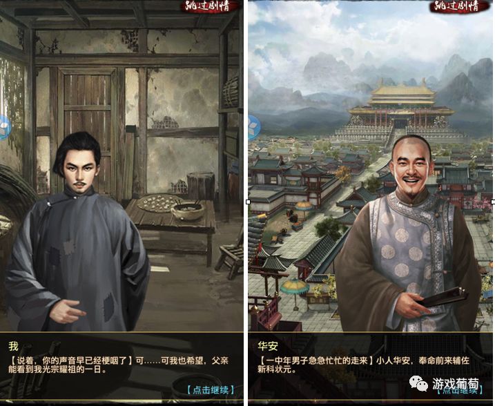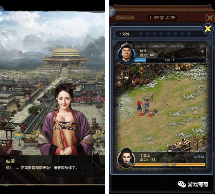 2. 更优秀的剧情。剧情其实是官场游戏“获得银两——培育角色——增加粮草、银两及士兵产量——消耗士兵推进关卡——看剧情”资源循环系统的终点,也是在游戏前中期玩家的主要动力。