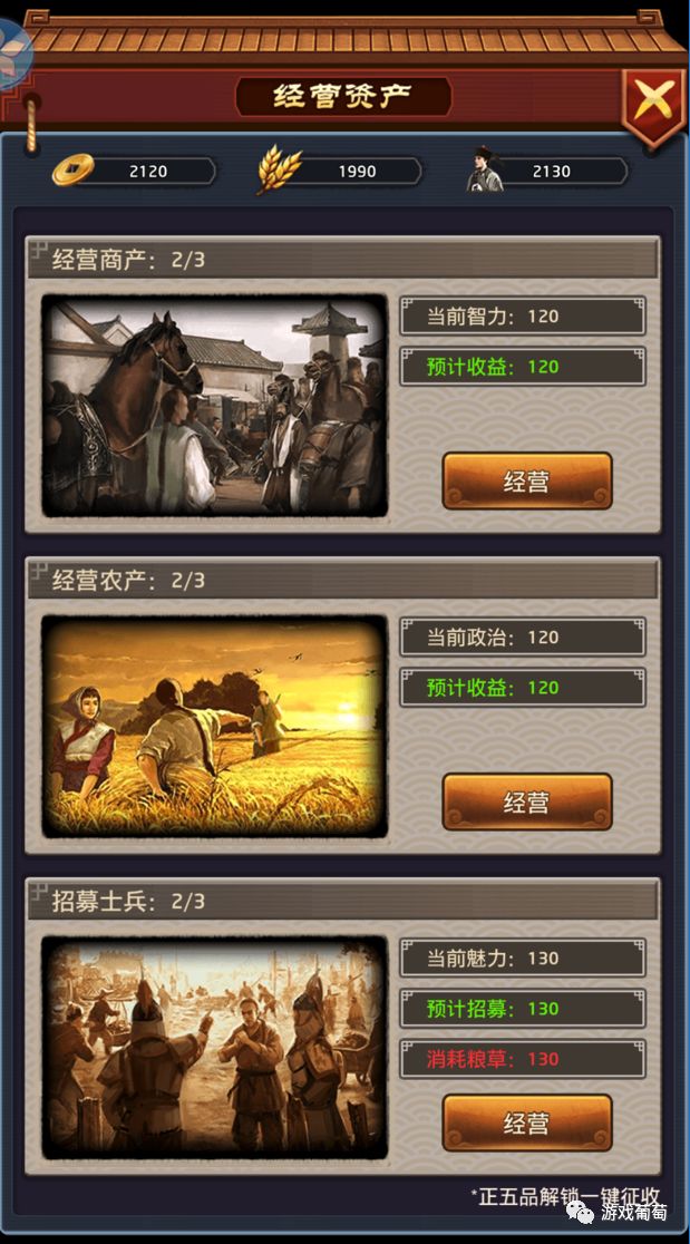 这些角色各有特长,资质也不大一样。你可以用银两和道具升级他们的等级和技能,这些属性会影响资源的获取和消耗情况:银两是升级角色的主要资源,粮草用来招兵,而士兵则是推进游戏进度的主要元素,资源循环系统非常简单。