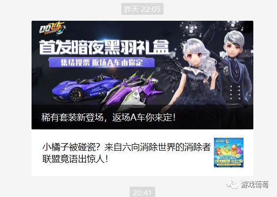 另外,《消除者联盟》也通过其他爆款游戏进行导量。比如QQ飞车公众号的内容中加入了《消除者联盟》广告,增大曝光率。