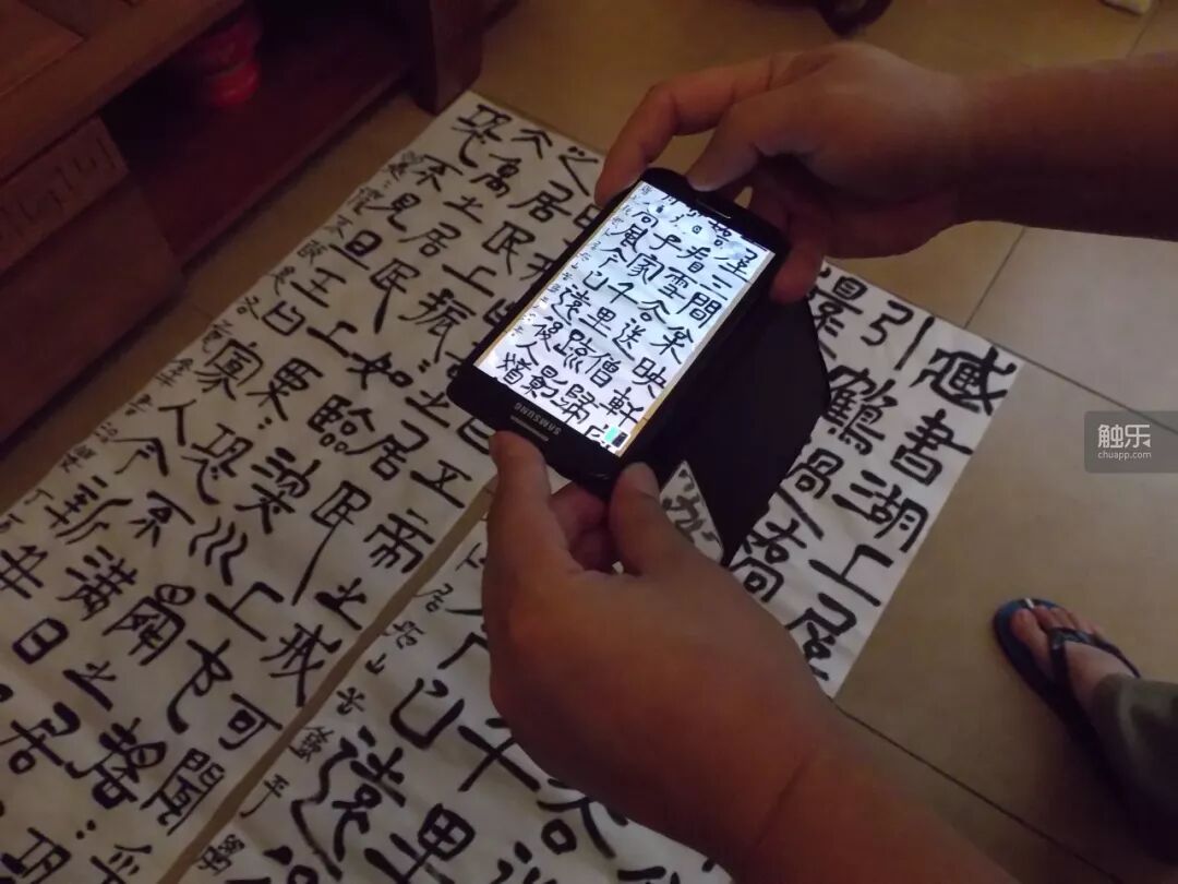 岳剑平跟我分享拍照的心得:“光线要自然,打水雾能够让纸平整,然后尽量不要拍歪,不然到Photoshop里还需要拉一下,你一拉,字就容易变形。”