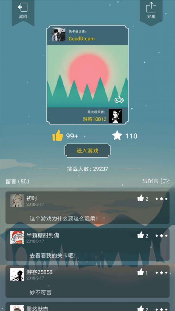 在关卡右上角,玩家可以看到该关卡被挑战的次数,也可以为它点赞;在关卡下方,还设有留言区,玩家在留言区的互动和讨论同样火热。