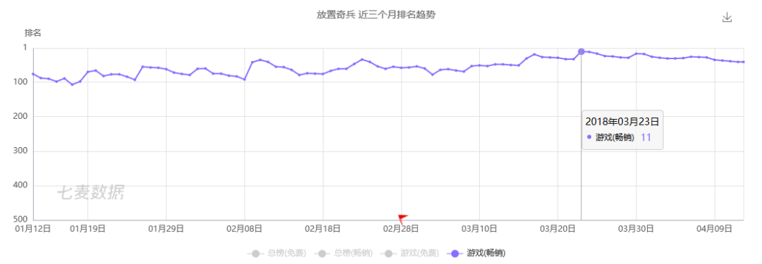 然而进入到2018年,《放置奇兵》却渐入佳境。从近三个月的畅销榜排名来看,《放置奇兵》基本保持在TOP100以内,一度进入TOP11。