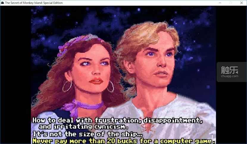 当时玩到那里,我是很开心的,笑得乐不可支。虽然我也想看他们有些原创的新花样,但另一方面我也觉得这样就很不错,这两种想法彼此拉锯着,在满足之余又有遗憾。大约我们小玩家长大了,心也大了。标准结局过后,也就更多了些不知何日才能与“猴岛”再续前缘的惆怅。