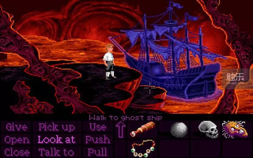 早期的一些图形冒险游戏脱胎于文字MUD,玩家需要在命令行里打字推动游戏发展,体验有点像是与苹果的Siri交谈,看起来自由,但有时候你完全不知道应该打些什么才能把游戏继续下去。SCUMM系统的意义就在于,玩者自此不再需要打字,只要用鼠标从画面底部选动词,再从物品栏或主画面选择宾语,即可形成有效指令。
