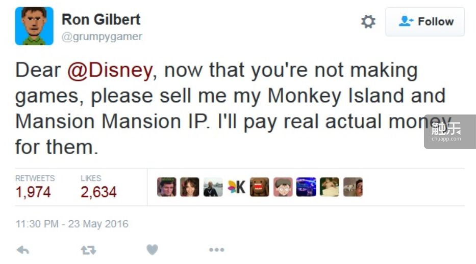 2012年,迪斯尼收购了卢卡斯,翌年便裁掉了LucasArts几乎所有员工,只留个壳子处理版权业务。2016年,《猴岛小英雄》原作者Ron Gilbert在推特上喊话:“亲爱的迪斯尼,既然你不做游戏了,把我的《猴岛小英雄》和《疯狂大楼》IP卖回给我吧,我会花真金白银买下来。”然而这事情到现在似乎还未见下文。