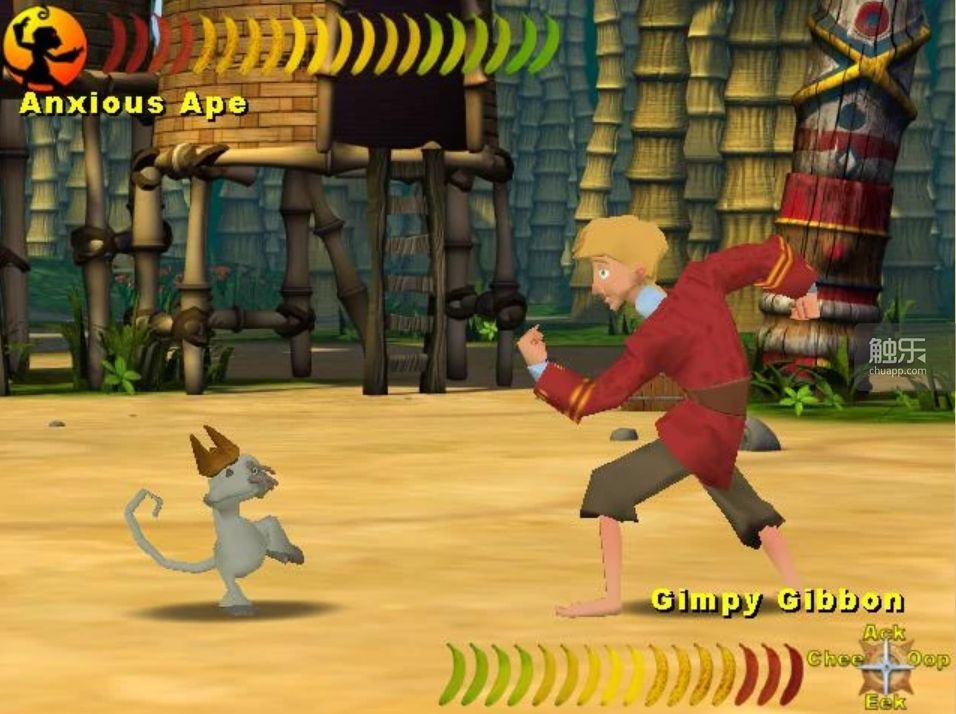 这一代的主要战斗系统,叫“猴拳快打”──Monkey Kombat,明显是《真人快打》(Mortal Kombat)的梗。基本上其实也就是猜拳,用上下左右键作出“啊”“咿”“呜”“吱”的叫声,3个叫声组成姿势,共有5种相互克制的有效姿势。你需要在猴岛上和猴子学会这些,最后驾驶巨猴神像和巨大化的老查对决。获胜的方式,当然也不能依循常理。
