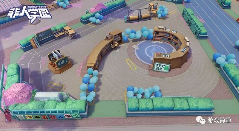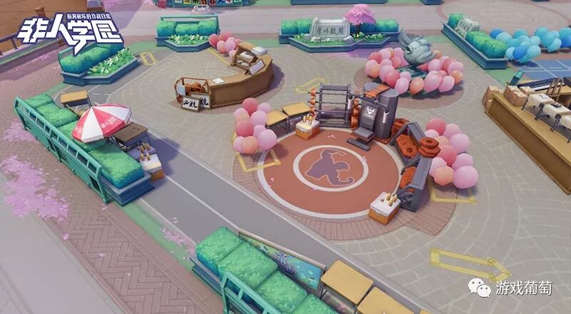 《非人学园》在角色之外的包装也很亮眼。和名字相同,游戏5v5的战斗地图就是一座正在举办庆典的学园,MOBA中的河道变成了操场跑道,草丛被设计成了气球堆,而红蓝Buff分别坐落在健身社和读书社中央: