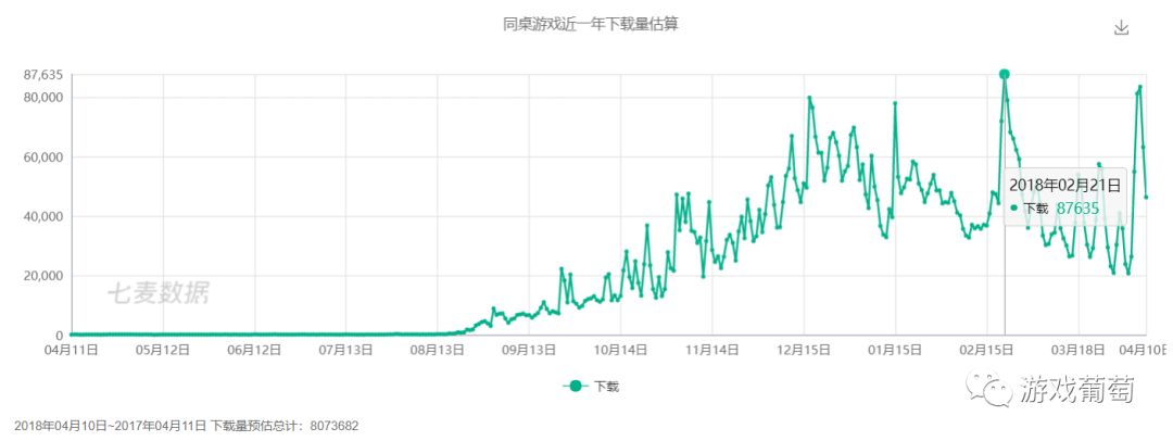 七麦数据也记录了相似的增长节奏:快手小游戏从1月中下旬起进入下载量爆发增长阶段;同桌游戏则是去年11月开始有明显增量,二者最高时每日下载都超过8万。