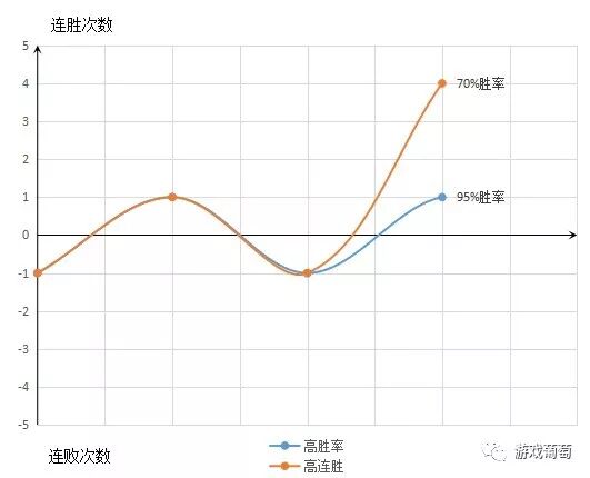 在我看来,图一的相对平稳的波动更有利于游戏的长期留存。为什么?注意我前面的那句话,后来调整过来又一波连胜使胜率又恢复平稳。是不是每个玩家在遭遇连败打击后,都能调整自己心态?说实话,即使我手上没有数据资料,仅凭我现实生活的人生经验就可以想象,玩家遭遇连败打击后,心态能平稳调整的佛系玩家会有多少。