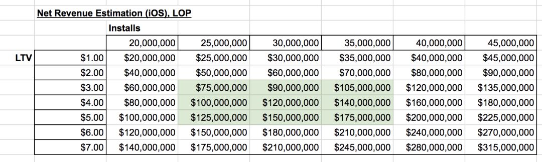 假设《堡垒之夜》的ARPI一直呈上升趋势,并随着时间(售卖皮肤)增长了3-5倍,那么其整体LTV则为3-5美金。
